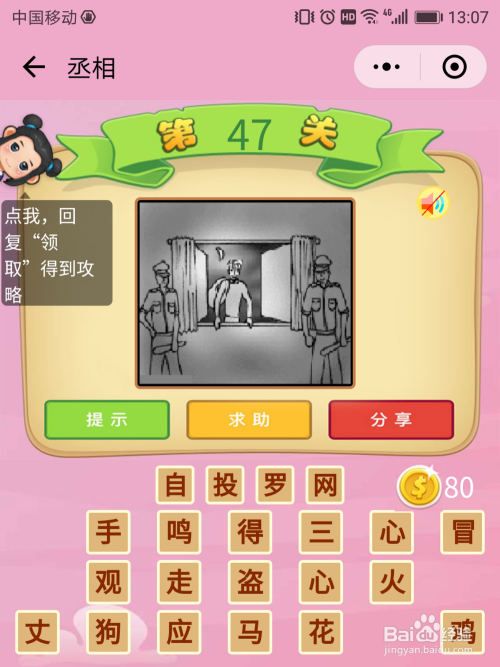 丞相47关谜底:窗外一个小偷正筹办进入窗户行窃,而窗户双方站了两差人筹办抓他,这个小偷的行为叫做【自投坎阱】。