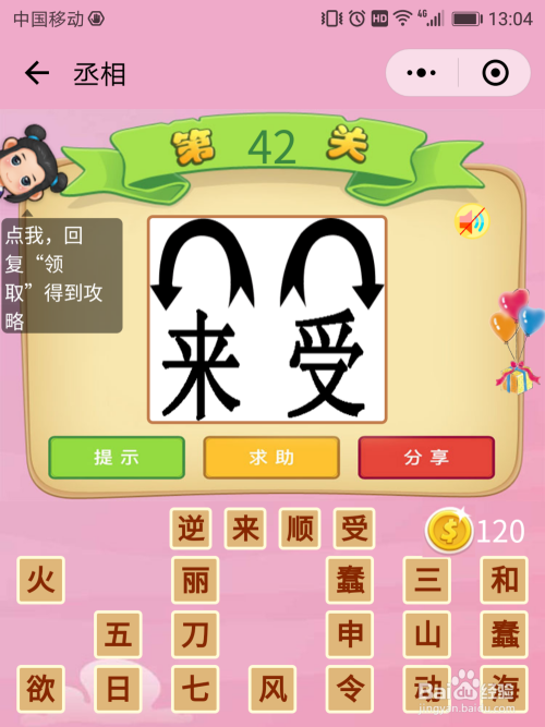 丞相42关谜底:图片上的两个文字上方各有一个箭头符号,这两个箭头符号防地并不不异,一个是顺时针一个是逆时针,这便轻易猜出当作语【逆来顺受】。