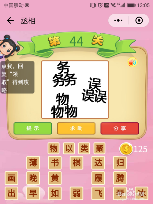 丞相44关谜底:图片上有三堆文字,每一堆文字都是一样的,这些文字发音都是wu,那么猜到当作语【物以类聚】。