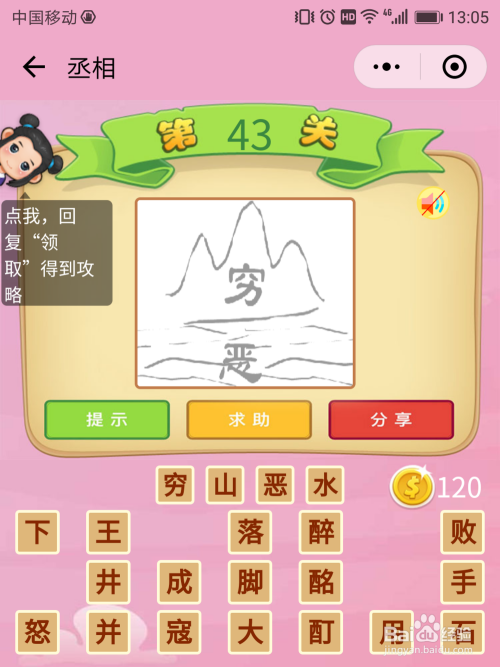 丞相43关谜底:按照图形与文字部门可以猜到当作语【穷山恶水】。