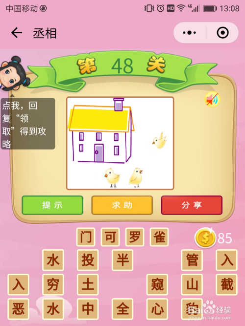 丞相48关谜底:房门外有良多鸟雀,鸟雀一多就申明来访人员很少,若是良多的话,鸟雀是不敢接近的。这即是【门可罗雀】形容的一种现象。