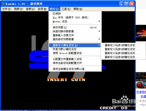 5、进入游戏之后,我们需要设置按键功能,选择菜单栏“游戏”-“从头界说键位设定···”-“从头界说玩家1键位设定···”,若是是单人玩,我们是玩家1,若是是两小我玩,电脑是玩家1,手柄或其他外接键盘是玩家2,我们以此类推来设定键位,设置完当作后点击“确定”。