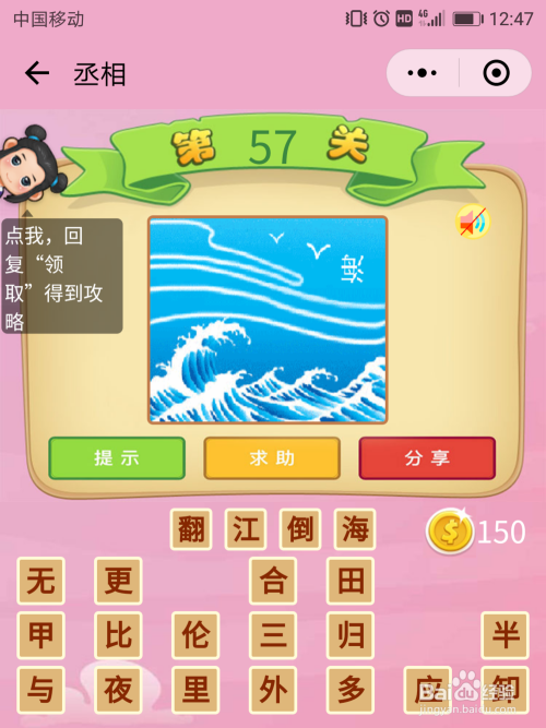 丞相57关谜底:画面上能看到一个倒着的海字,别的还有良多的水,猜出来是【排山倒海】。