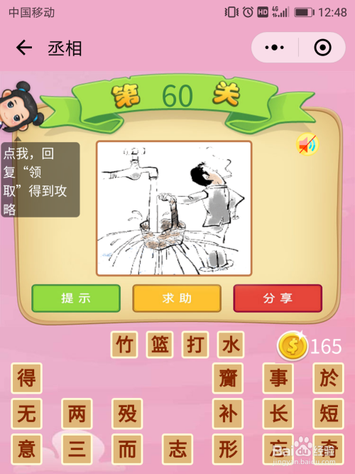 丞相60关谜底:这小我抽着烟很优哉游哉的样子,而一旁却用一个竹篮在水龙头下接水,这即是【竹篮吊水】。