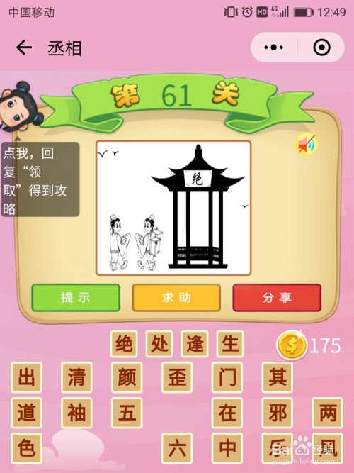 丞相61关谜底:看这两人的样子应该是古时辰的墨客吧,两人在此重逢,而别的一侧的亭子上写着绝字,如许就能猜出是【绝处逢生】。