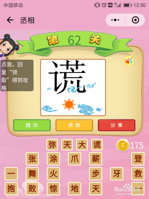 丞相62关谜底:页面上有太阳和云朵,这申明是在天上,除此之外还有个汉字谎,这个谎字很年夜,就是年夜谎,便能猜到是【弥天年夜谎】。