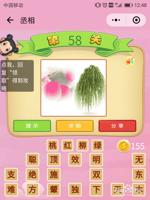 丞相58关谜底:页面上有两组小图,别离是桃子和柳树,连系其颜色就能猜到【桃红柳绿】。
