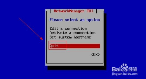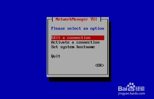 输入nmtui运行,在出来的图形界面中,按偏向键选中“Edit a connection”后,回车确认。