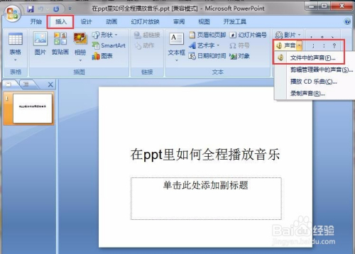 我们一般是利用插入菜单下的声音东西来插入我们筹办好的音频文件的,点击声音菜单下的文件中的声音选项,然后选择我们的是mp3文件上传。