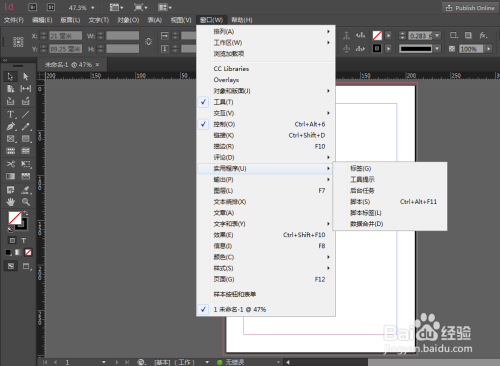 打开InDesign,新建一个文件,选择菜单栏中窗口--适用法式--数据归并。