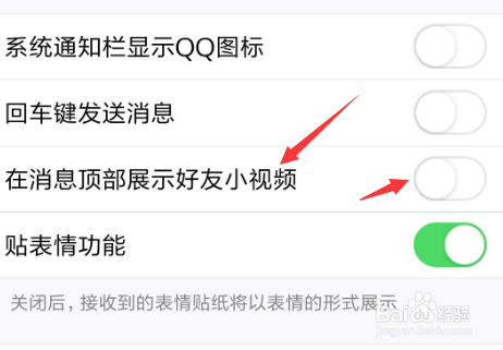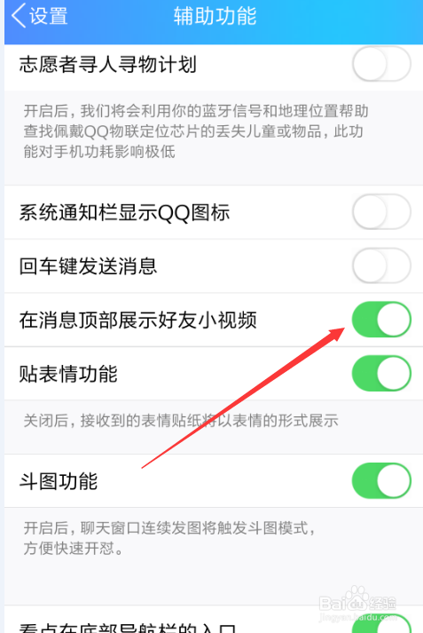 在辅助功能里。在动静顶部展示老友小视频默认状况是打开