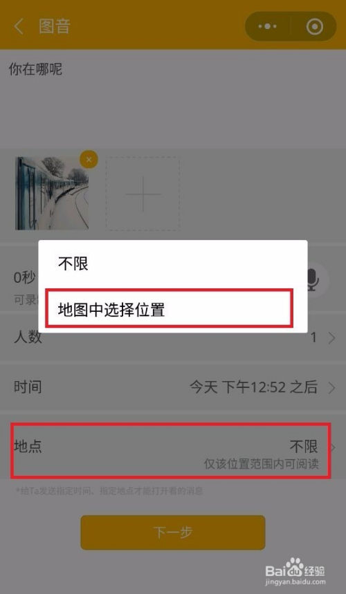 进入到编纂页面后,在编纂框中输入你想和对方说的话,点击添加图片,然后在时候选项中选择你想设定的时候,点击地址设置时,在弹出的提醒框中点击【地图中选择位置】,如图9