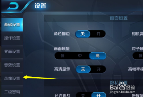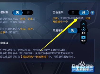 打开设置之后我们依次找到录像设置,在这个设置的右边有一个自由录屏的按钮我们把它打开。