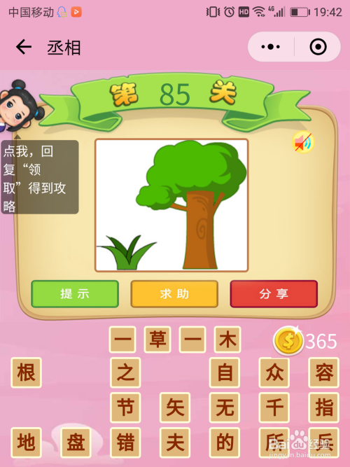 丞相85关谜底:画面上就一棵树一株草,除此之外别无其他信息了,那么我们就很轻易猜出是【一草一木】。