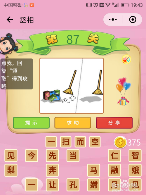 丞相87关谜底:左边有良多垃圾,右边则什么都没有了,怎么没有的?用扫把扫清洁的,这即是【一网打尽】。