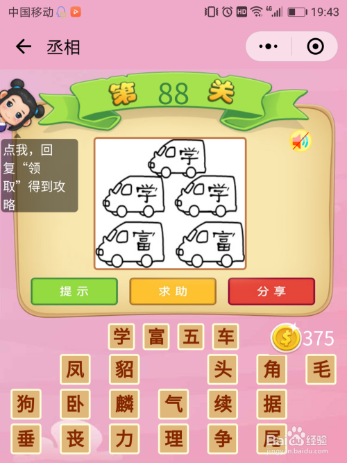 丞相88关谜底:这个题算是比力轻易了,因为很是形象五辆车子上别离写着学和富字,这天然能想到【才当曹斗】这个当作语了,形容常识赅博。