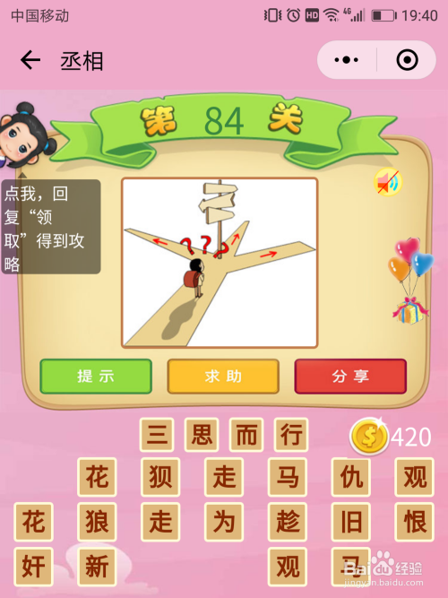 丞相84关谜底:一人走到路口,迎接他的有三条路,那么走那一条路呢?他必需【三思而行】,不然很轻易走错。