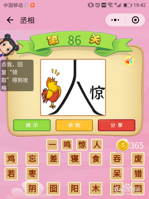 丞相86关谜底:左边的公鸡在打鸣,中心是个年夜年夜的人字,而右侧是个惊字,这即是当作语【一鸣惊人】。