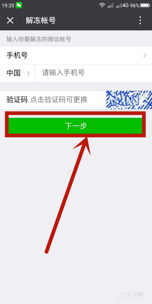 在解冻账号页面输入要解冻的微信账号绑定的手机号码和验证码,点击“下一步”
