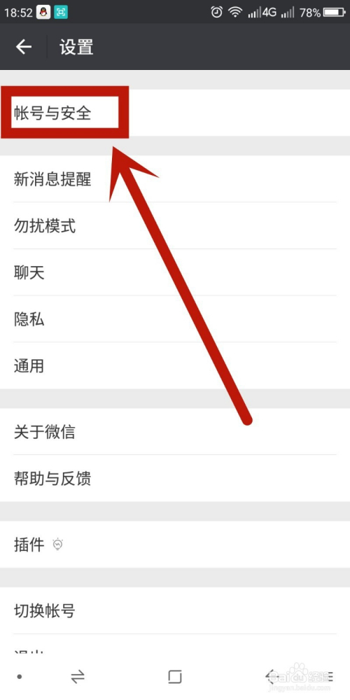在设置页面找到“账号与平安”,后单击