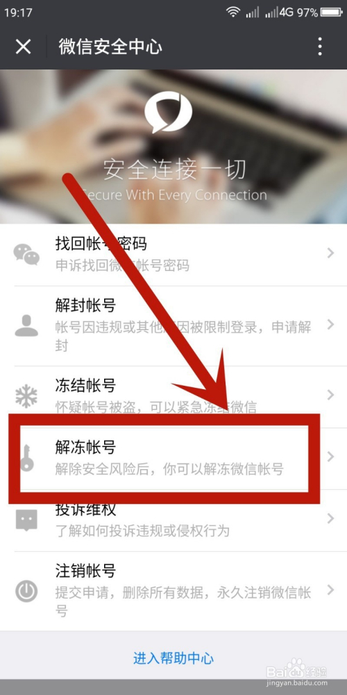 在微信平安中间找到“解冻账号”单击