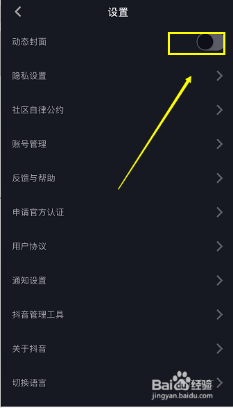 进入设置可以看到动态封面,默认后面的开关是打开的,如下图所示