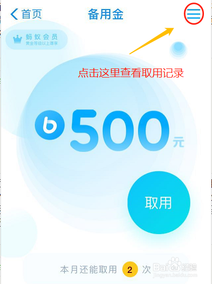 点击今后就进入到"备用金"页面了,从页面上可以看到今朝只有芝麻分年夜于650分的黄金品级以上会员才有资格开通此活动,并且备用金金额只有500元,每月可以或许取用2次,并且还完一次今后才能再次申请哦;