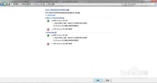 别离封闭家庭和工作收集、公用收集防火墙,并点击窗口下方确定按钮;