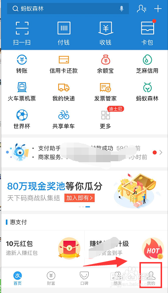 进入付出宝首页,点击右下角的我的,如下图所示
