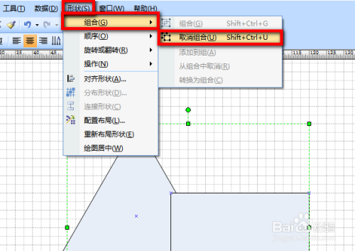 选中已经组合好的图形,然后点击菜单中的【外形】-【组合】-【打消组合】,如许两个或者是多个组合好的图形就会被当作功分化开来。