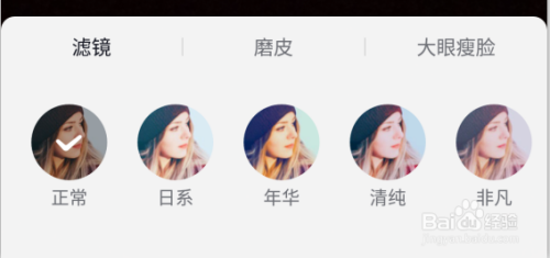 然后就呈现美化选项了,别离是【滤镜、磨皮、年夜眼瘦脸】