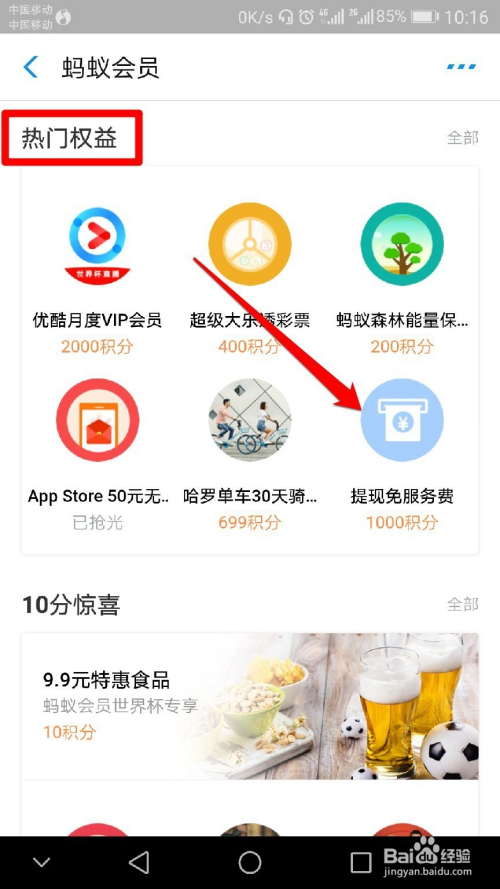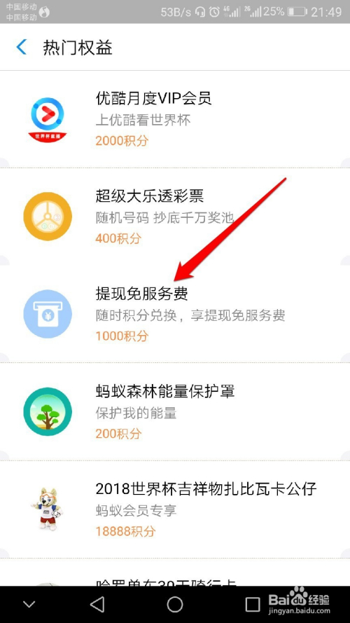 找到【热点权益】-【提现免费额度】,在这里你可以用1000蚂蚁积分兑换1000至3000不等数值的免费提现额度(具体参照下图)