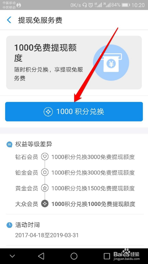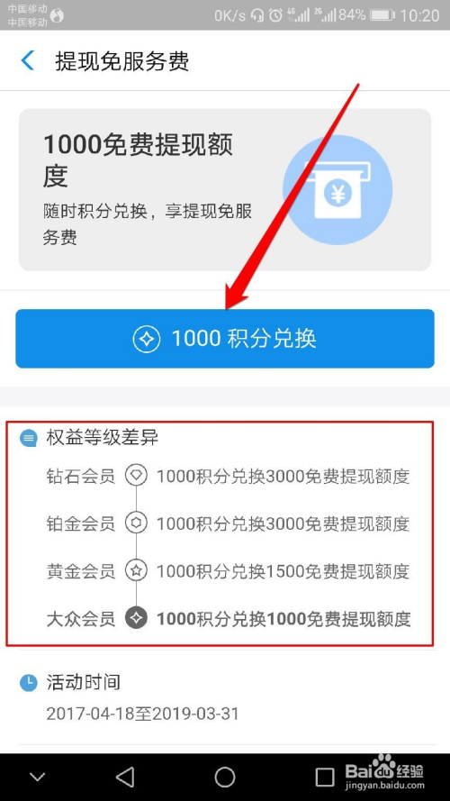 最后点击【免费提现额度】-【1000积分兑换】-【确认兑换】