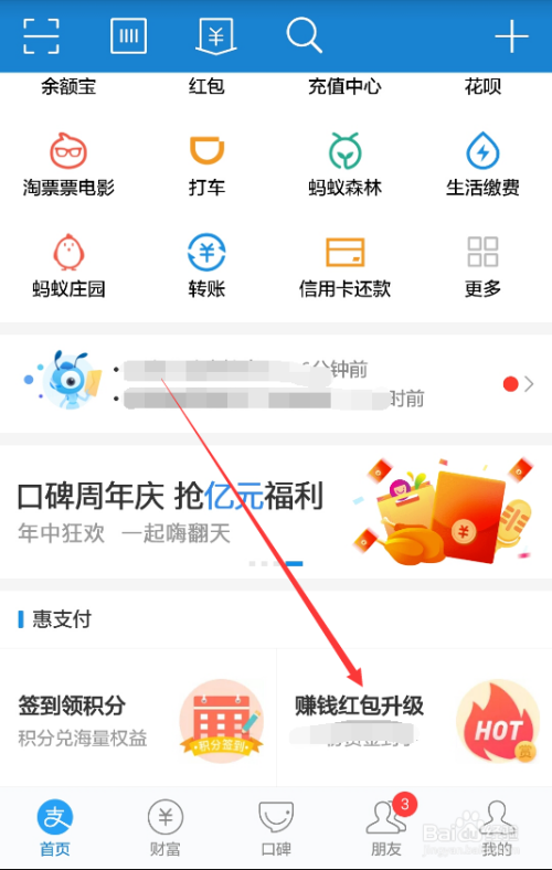 付出宝红包搜刮码今朝比力火,在付出宝首界面的下面是有直接点击进入的进口,直接点击【赚钱红包进级】就可以快速进入,如下图所示。