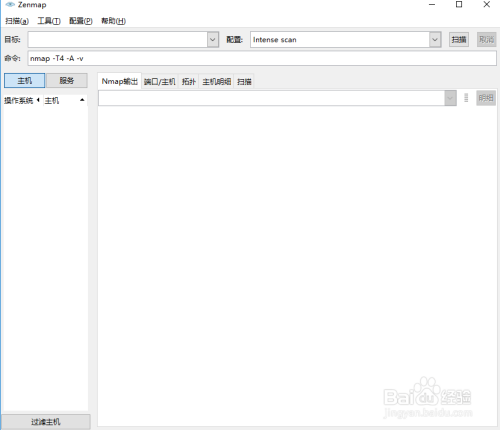 打开Zenmap,假设我们要扫描一个网段,那么在号令框输入:nmap -p 1-65535 -T4 -A -v IP网段(如 xx.xx.xx.0/24是一个c段),然后点击扫描。