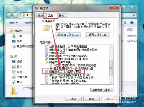 打开文件夹和搜刮选项后,就会呈现一个文件夹选项的窗口,我们点击这个窗口上的查看菜单,然后鄙人方的高级设置中找到埋没已知文件类型的扩展名选项。