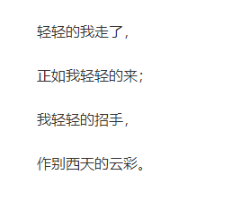 轻轻的我走了, 正如我轻轻的来; 我轻轻的招手, 道别西天的云彩。