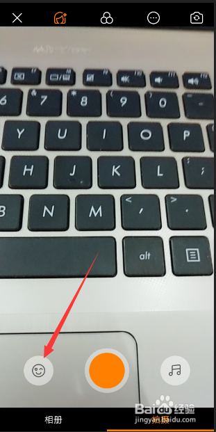 点击打开拍摄页面,看到拍摄按钮左侧,有个娃娃一样的图标,选择点击它。