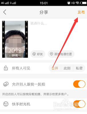 接下来就是到了发布页面,输入想要说的话,设置视频权限,是否许可合拍等,完当作后点击发布。如许就ok啦。