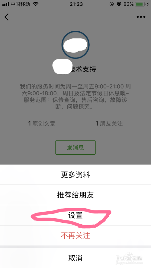 在弹出的页面中点击设置,记得不要点击不再存眷,那就是打消存眷了。