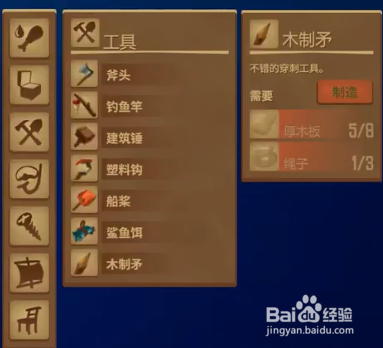 在物品制造里找到木质矛,需要厚木板5个、绳索3个