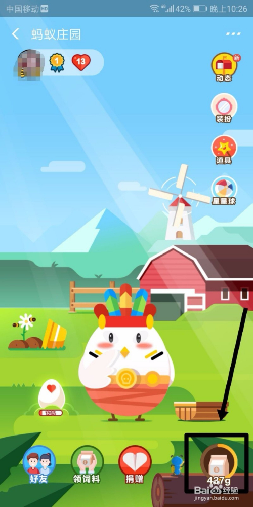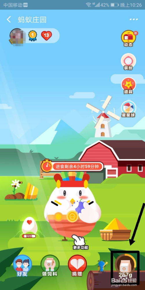 回到蚂蚁庄园的本家儿页面,就会发现,你的饲料槽里,多了180g饲料。就可以继续喂养小鸡了!