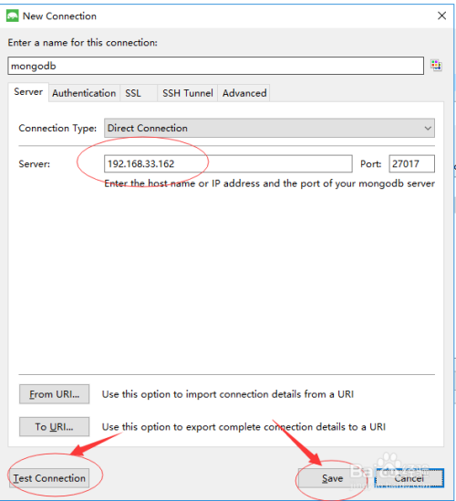 在弹出的新建毗连对话框中,输入局域网内的MongoDB办事器的IP地址,如下图所示: