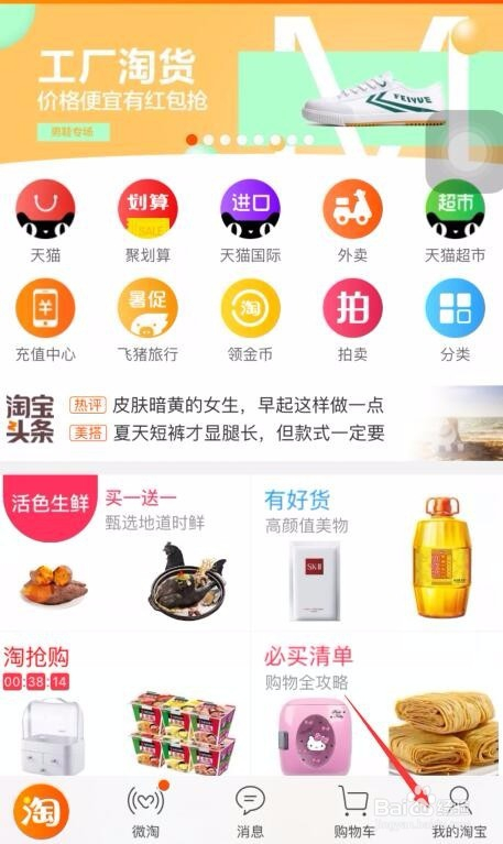 打开手机淘宝之后,点击淘宝首页最后一行最后一个图标,就是我的淘宝。