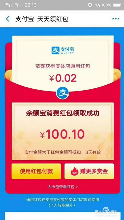 - 在点击领红包后,可能是出来的是 一个0.02的实体红包,下面有个额外的余额宝红包,直接点击就可以领取。领到的红包要实时到实体店里消费抵扣