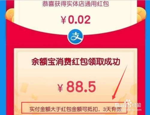 【PS】要注重的是,您在点击领红包后,可能是出来的是 一个0.02的实体红包,这个是到实体店里消费抵扣,方法取年夜额的余额宝抵扣红包,需要我们手动点击领取的哦,如下图所示