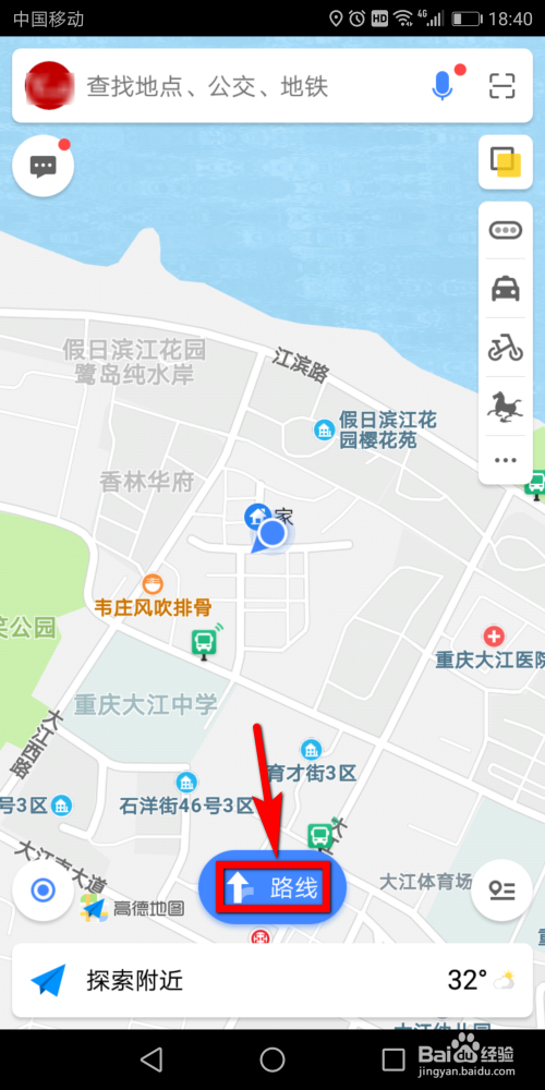 进步前辈入高德地图,进入后在页面的正下方中心位置点击【路线】,如图所示。
