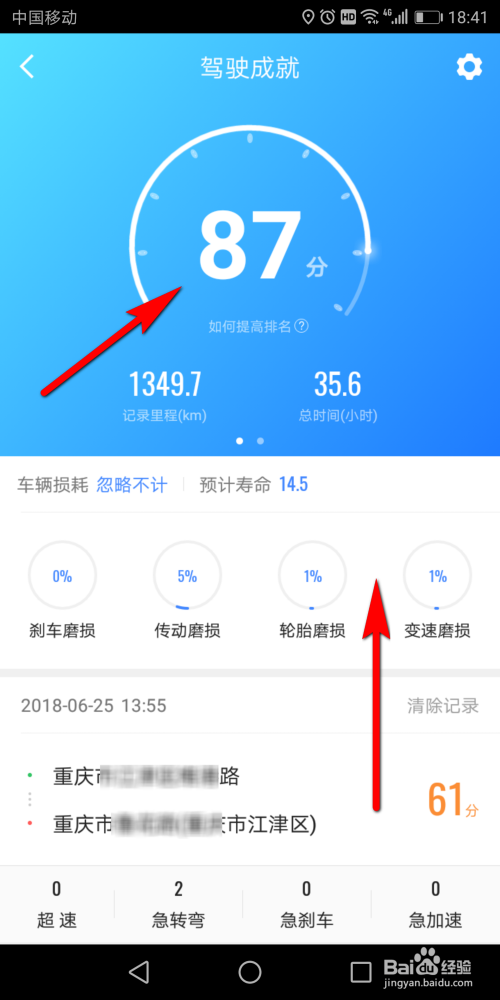 如许在页面的最上方就可以看到本身驾驶的综合得分了,每一次路线的驾驶得分鄙人方显示,若是标的目的查看更多路线的驾驶得分的话,就往上拉动页面。