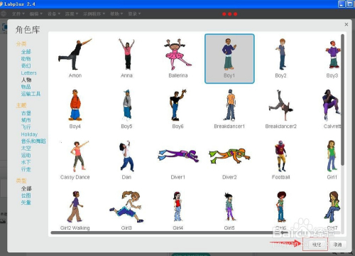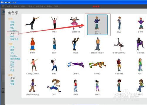 我们可以按照需要找到相关的类别,在该类别中找到本身需要的脚色,如人物里的Boy1;