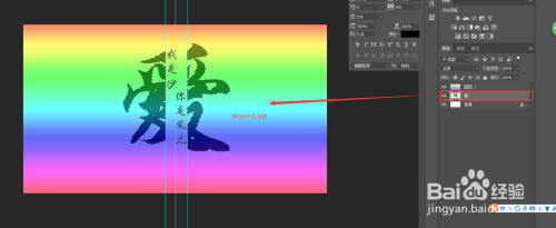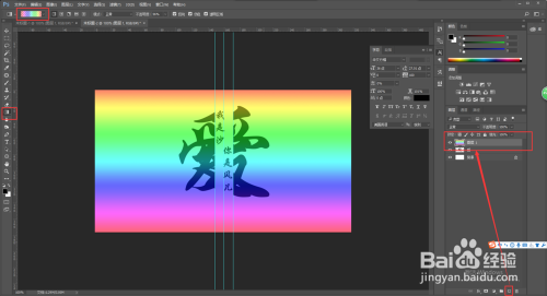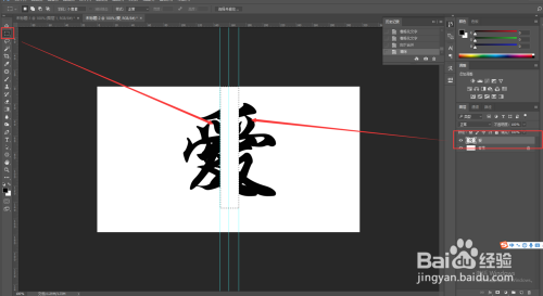 依次选中两个文字图层,然后右键将其栅格化,在选中上方的拷贝文字层,按Ctrl+E归并下方图层,将两个文字图层进行归并,在选中矩形选框东西,将摆布参考线中心的位置框选中,按delete键删除。